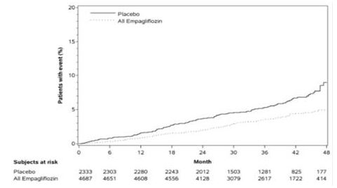 EMPA‑REG OUTCOME 시험에서, 복합평가변수인 신규 또는 악화된 신장병증 (현성알부민뇨 발생, 혈청 크레아티닌의 2배 증가, 신장 치환 요법 (혈액투석) 시작 및 신장병으로 인한 사망으로 정의됨)의 첫 발생까지의 시간에 대한 위험비(HR)는 0.61(95% CI 0.53, 0.70)이었다. (엠파글리플로진 12.7%, 위약 18.8%).