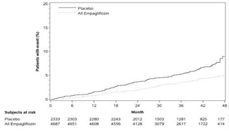 EMPA‑REG OUTCOME 시험에서, 복합평가변수인 신규 또는 악화된 신장병증 (현성알부민뇨 발생, 혈청 크레아티닌의 2배 증가, 신장 치환 요법 (혈액투석) 시작 및 신장병으로 인한 사망으로 정의됨)의 첫 발생까지의 시간에 대한 위험비(HR)는 0.61(95% CI 0.53, 0.70)이었다. (엠파글리플로진 12.7%, 위약 18.8%).