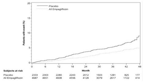EMPA‑REG OUTCOME 시험에서 엠파글리플로진은 위약과 비교하였을 때 심부전으로 인한 입원의 위험을 감소시켰다 (엠파글리플로진 2.7 %; 위약 4.1 %; 위험비(HR) 0.65, 95 % CI 0.50, 0.85).