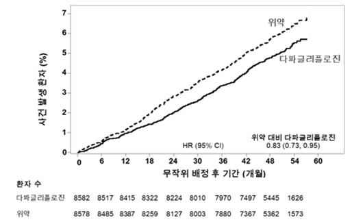다파글리플로진 10mg은 일차 복합 평가변수인 심부전으로 인한 입원 또는 심혈관계 질환 사망의 예방에 대해 위약 대비 우월한 효과를 나타냈다 (그림 1).