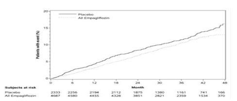 EMPA‑REG OUTCOME 시험에서 엠파글리플로진은 위약과 비교하였을 때 심부전으로 인한 입원의 위험을 감소시켰다 (엠파글리플로진 2.7 %; 위약 4.1 %; 위험비(HR) 0.65, 95 % CI 0.50, 0.85).