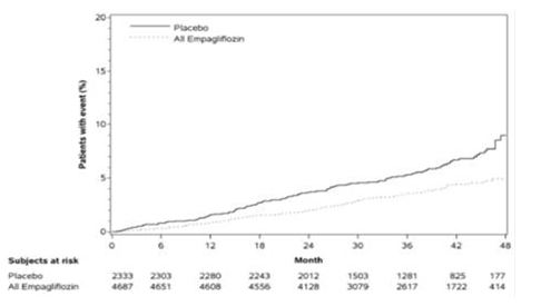 또한 현성알부민뇨가 있는 환자에서 지속적인 정상알부민뇨 또는 미세알부민뇨로의 전환은 위약대비 엠파글리플로진에서 더 높게 나타났다. (엠파글리플로진 49.7%, 위약 28.8%, 위험비(HR) 1.82, 95 % CI 1.40, 2.37).