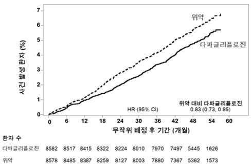 다파글리플로진의 위약 대비 치료 유익성은 베이스라인에서의 심혈관계 질환의 유무 및 기저 심부전의 유무와 관계없이 관찰되었고, 연령, 성별, 신기능 (eGFR) 및 지역 등 핵심 하위군 전반에서 일관성을 보였다.