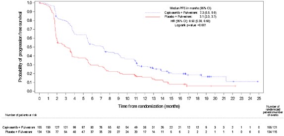 전체 모집단과 PIK3CA/AKT1/PTEN 변이 하위그룹 둘 다에서 이 약과 풀베스트란트를 받은 환자의 PFS가 위약과 풀베스트란트를 받은 환자 대비 통계적으로 유의한 차이가 관찰되었다. 연구자 평가에 의한 PFS 결과는 눈가림된 독립적 중앙 검토위원회 (BICR) 평가로부터 나온 일치된 결과에 의해 뒷받침되었다. 종양에 PIK3CA/AKT1/PTEN 변이가 없는 것으로 확인된 환자 313명(44%)의 PFS에 대한 탐색적 분석에서 HR은 0.79(95% CI: 0.61, 1.02)로 나타났으며, 이는 전체 집단에서 관찰된 차이가 주로 PIK3CA/AKT1/PTEN 변이가 있는 환자집단에서 나타난 결과에서 기인했음을 의미했다.