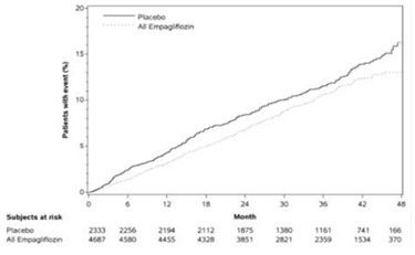 또한 현성알부민뇨가 있는 환자에서 지속적인 정상알부민뇨 또는 미세알부민뇨로의 전환은 위약대비 엠파글리플로진에서 더 높게 나타났다. (엠파글리플로진 49.7%, 위약 28.8%, 위험비(HR) 1.82, 95 % CI 1.40, 2.37).