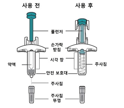 중요 : 우발적으로 주사침에 찔리는 것을 최소화하기 위하여, 이 시린지에는 안전 보호대가 장착되어 있으며, 이는 투여가 끝난 후 자동으로 작동하여 주사침을 덮을 것이다.