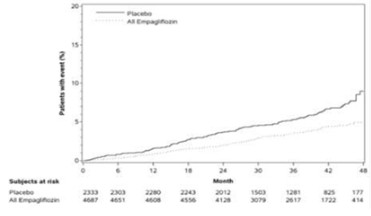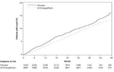 총 7,020명의 환자(엠파글리플로진 10 mg: 2,345명, 엠파글리플로진 25 mg: 2,342명, 위약: 2,333명)가 투여 받았고 3.1년(중앙값) 동안 추적되었다. 평균 연령은 63세, 평균 HbA1c는 8.1%이었고, 71.5%가 남성이었다. 베이스라인에서 메트포르민 투여 환자는 전체 환자의 74%, 인슐린 투여 환자는 48%, 설포닐우레아 투여 환자는 43%이었다. 사구체 여과율(eGFR)이 60‑90 ml/min/1.73 m