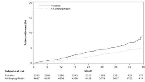 EMPA‑REG OUTCOME 시험에서 엠파글리플로진은 위약과 비교하였을 때 심부전으로 인한 입원의 위험을 감소시켰다 (엠파글리플로진 2.7 %; 위약 4.1 %; 위험비(HR) 0.65, 95 % CI 0.50, 0.85).
