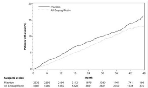 또한 현성알부민뇨가 있는 환자에서 지속적인 정상알부민뇨 또는 미세알부민뇨로의 전환은 위약대비 엠파글리플로진에서 더 높게 나타났다. (엠파글리플로진 49.7%, 위약 28.8%, 위험비(HR) 1.82, 95 % CI 1.40, 2.37).