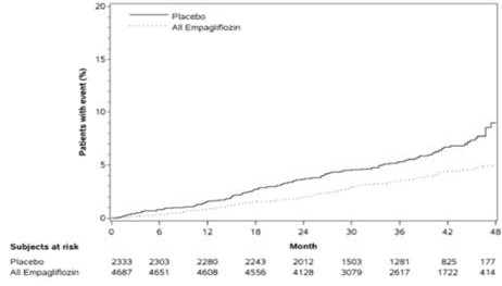 EMPA‑REG OUTCOME 시험에서 엠파글리플로진은 위약과 비교하였을 때 심부전으로 인한 입원의 위험을 감소시켰다 (엠파글리플로진 2.7 %; 위약 4.1 %; 위험비(HR) 0.65, 95 % CI 0.50, 0.85).