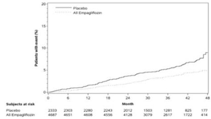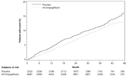EMPA‑REG OUTCOME 시험에서 엠파글리플로진은 위약과 비교하였을 때 심부전으로 인한 입원의 위험을 감소시켰다 (엠파글리플로진 2.7 %; 위약 4.1 %; 위험비(HR) 0.65, 95 % CI 0.50, 0.85)