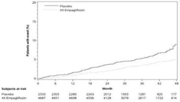 또한 현성알부민뇨가 있는 환자에서 지속적인 정상알부민뇨 또는 미세알부민뇨로의 전환은 위약대비 엠파글리플로진에서 더 높게 나타났다. (엠파글리플로진 49.7%, 위약 28.8%, 위험비(HR) 1.82, 95 % CI 1.40, 2.37).
