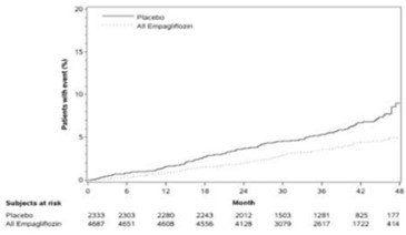 EMPA‑REG OUTCOME 시험에서 엠파글리플로진은 위약과 비교하였을 때 심부전으로 인한 입원의 위험을 감소시켰다 (엠파글리플로진 2.7 %; 위약 4.1 %; 위험비(HR) 0.65, 95 % CI 0.50, 0.85).