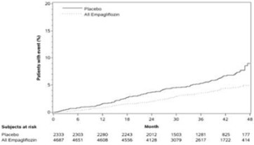 또한 현성알부민뇨가 있는 환자에서 지속적인 정상알부민뇨 또는 미세알부민뇨로의 전환은 위약대비 엠파글리플로진에서 더 높게 나타났다. (엠파글리플로진 49.7%, 위약 28.8%, 위험비(HR) 1.82, 95 % CI 1.40, 2.37).
