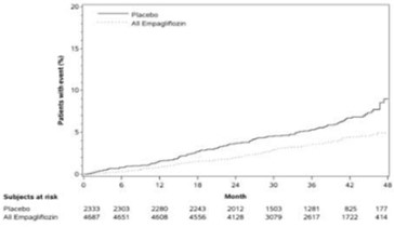 EMPA‑REG OUTCOME 시험에서 엠파글리플로진은 위약과 비교하였을 때 심부전으로 인한 입원의 위험을 감소시켰다 (엠파글리플로진 2.7 %; 위약 4.1 %; 위험비(HR) 0.65, 95 % CI 0.50, 0.85).