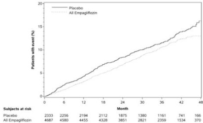 또한 현성알부민뇨가 있는 환자에서 지속적인 정상알부민뇨 또는 미세알부민뇨로의 전환은 위약대비 엠파글리플로진에서 더 높게 나타났다. (엠파글리플로진 49.7%, 위약 28.8%, 위험비(HR) 1.82, 95 % CI 1.40, 2.37).