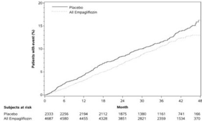 또한 현성알부민뇨가 있는 환자에서 지속적인 정상알부민뇨 또는 미세알부민뇨로의 전환은 위약대비 엠파글리플로진에서 더 높게 나타났다. (엠파글리플로진 49.7%, 위약 28.8%, 위험비(HR) 1.82, 95 % CI 1.40, 2.37).
