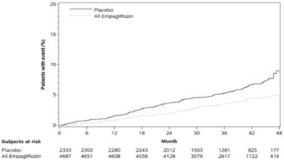 이중눈가림, 위약 대조 시험인 EMPA‑REG OUTCOME 임상시험에서 확인된 죽상동맥경화성 심혈관계 질환이 있는 제 2형 당뇨 환자에서 표준 치료에 추가 투여한 엠파글리플로진(10 mg 및 25 mg 용량을 통합)과 위약을 비교하였다. 총 7,020명의 환자(엠파글리플로진 10 mg: 2,345명, 엠파글리플로진 25 mg: 2,342명, 위약: 2,333명)가 투여 받았고 3.1년(중앙값) 동안 추적되었다. 평균 연령은 63세, 평균 HbA1c는 8.1%이었고, 71.5%가 남성이었다. 베이스라인에서 메트포르민 투여 환자는 전체 환자의 74%, 인슐린 투여 환자는 48%, 설포닐우레아 투여 환자는 43%이었다. 사구체 여과율(eGFR)이 60‑90 ml/min/1.73 m2인 환자는 52.2%, 45‑60 ml/min/1.73 m2 환자는 17.8%, 30‑45 ml/min/1.73 m2 환자는 7.7%이었다.