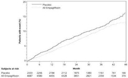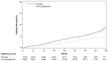 EMPA ‑REG OUTCOME 시험에서 엠파글리플로진은 위약과 비교하였을 때 심부전으로 인한 입원의 위험을 감소시켰다 (엠파글리플로진 2.7 %; 위약 4.1 %; 위험비(HR) 0.65, 95 % CI 0.50, 0.85).