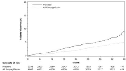 또한 현성알부민뇨가 있는 환자에서 지속적인 정상알부민뇨 또는 미세알부민뇨로의 전환은 위약대비 엠파글리플로진에서 더 높게 나타났다. (엠파글리플로진 49.7%, 위약 28.8%, 위험비(HR) 1.82, 95 % CI 1.40, 2.37).