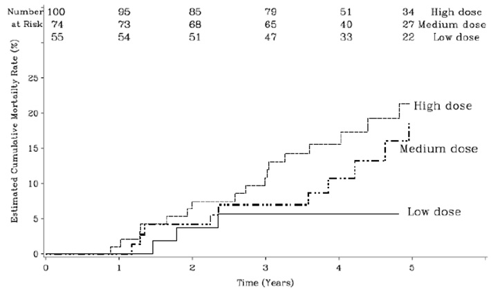 16주간의 연구 완료 후에, 이 약을 투여받도록 배정되었던 환자는 그 용량을 유지하였으며, 위약으로 배정되었던 환자는 이 약을 용량별로 투여받도록 다시 무작위 배정되었다. 16주간의 추적관찰 후 모든 환자들에 대한 맹검이 해제되었으며, 용법ㆍ용량에 따라 투여량을 조정하였다. 환자들은 중앙값 4세(범위 0.3~7.0세)였다. 연구기간 동안 투여받던 용량에서의 사망률은 다음과 같다.
