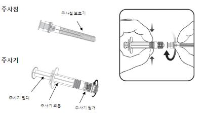 8) 프리필드시린지에 들어 있는 첨부용제로 백신을 용해하는 방법은 다음과 같다.프리필드시린지에 들어 있는 첨부용제 전량을 분말이 들어 있는 바이알에 가하여 용해한다.주사침을 주사기에 장착하는 방법은 아래 그림과 같다. 본제의 주사기는 아래 그림과 약간 다를 수 있다.