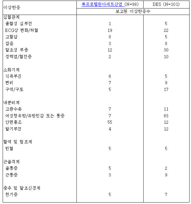(6) 이 약은 스테로이드와 관계없는 펩티드이므로, 스테로이드(예 : 디에칠스틸베스트롤(DES))의 장기 투여에서 보이는 심혈관계 이상반응이 관찰되지 않았다. 이 약(1 mg/일)과 DES(3 mg/일)의 비교임상시험에서 DES군은 101명 중 18명이 이상반응으로 인해 시험을 중단했고, 이 약군은 98명 중 3명이 시험을 중단했다. 이 약은 안면홍조의 발생율이 높았고, DES는 혈전색전증, 부종, 구역과 구토, 여성형유방과 유방통증의 높은 발생률과 관련이 있었다. DES와 이 약의 비교시험에서 보고된 이상반응은 다음과 같다. 약물과 인과관계가 없는 반응은 제외되었다.