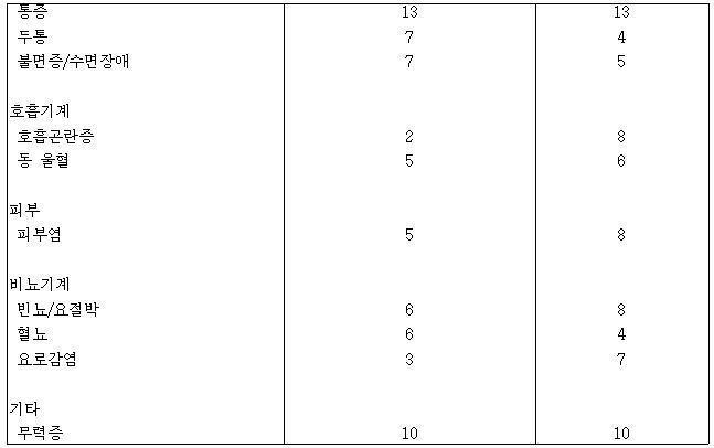 (7) 근골격계 : 강직성척추증, 관절장애, 관절통, 근육통, 골반섬유증, 척추골절, 마비, 건초염양 증상
