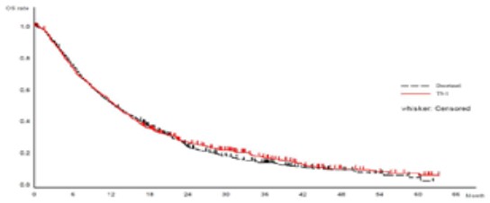 기관을 제외한 모든 무작위 변수를 공변량으로하여 cox 비례위험모형으로 추정 된 전체생존기간의 위험 비(TS‑1 / Docetaxel)는 0.945(95% CI, 0.8333‑1.073)였다. 위험 비의 95% 신뢰구간의 상한선이 사전 정의된 비열등성 마진인 1.2보다 낮은 것으로 TS‑1의 도세탁셀에 대한 비열등성을 확인했다. 위험 비 95% 신뢰구간의 상한선이 1.0을 초과했으므로, TS‑1의 도세탁셀에 대한 우월성은 확인되지 않았다. 공변량으로 무작위 변수를 포함하지 않는 모형으로 추정 된 위험 비는 0.960(95% CI, 0.846‑1.089)였다. 위험 비의 95% 신뢰구간의 상한선이 사전 정의된 비열등성 마진 아래로 떨어지며, 따라서 모든 무작위 변수를 공변량으로 사용한 모형으로부터 추론 된 결과를 뒷받침한다. 생존기간의 중간값은 도세탁셀 투여군에서는 12.52개월(95% CI, 11.14‑14.36), TS‑1 투여군에서는 12.75개월(95% CI, 11.53‑14.00)이었다(표 3). PFS, TTF, RR 및 TDS에서도 TS‑1 치료와 도세탁셀 치료가 유사한 것으로 나타났다. 이러한 결과는 1차 평가변수의 분석결과와 일치했다. 치료군 사이의 QOL 평가에서 확인된 차이는 약물 독성 프로파일의 차이와 일치했다.