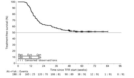 TFR기의 환자 126명 중, 74명(58.7%)은 48주 자료 마감일 또는 그 이전에 무치료 생존(TFS) 사례가 없었다. 48주 자료 마감일 기준, TFS 중앙값의 KM 추정치에는 아직 도달하지 않았다(그림 12).